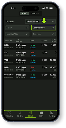 - Khi lệnh thỏa mãn điều kiện kích hoạt sẽ được đẩy lên sàn, nhà đầu tư kiểm tra lệnh kích hoạt ở Sổ lệnh thường hoặc tab Lệnh phát sinh