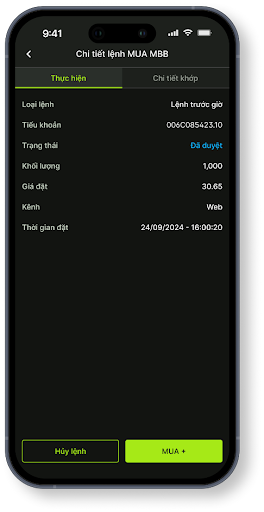 - Lệnh MUA thành công khi tài khoản chứng khoán có đủ tiền (sức mua)