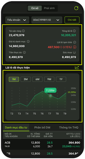 - Mục đích: Theo dõi thông tin tổng hợp của tài khoản, hiển thị danh mục chứng khoán cơ sở của khách hàng đầu tư, lãi lỗ trên giá vốn và giá hiện tại của chứng khoán